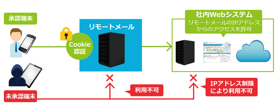 管理者が指定した端末からのみ利用できるリモートメールの仕組みを使って、スマートフォンやタブレットから社内のWebインフラ(ブラウザで動くインフラ)に接続できるオプションをご用意しています。