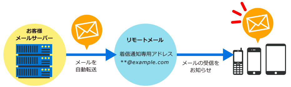 受信したメールを着信通知専用のアドレスに自動転送いただくことで、着信通知先に指定した携帯アドレス等にメールが来たことをお知らせします。