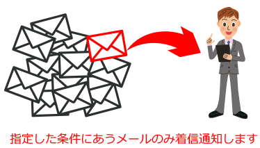 メールの受信量が多く、着信通知メールが増えることをご心配の場合には、特定着信通知機能の利用で特定の送信者からのメールのみ、特定の件名のみを通知する等の設定ができます。