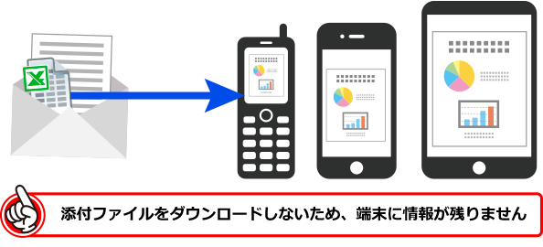 リモートメールでは、メールに添付されたOfficeファイルやPDFファイル、zip等のアーカイブファイル(パスワードで保護されたファイルにも対応)を、端末にダウンロードすることなく閲覧・展開することができます。