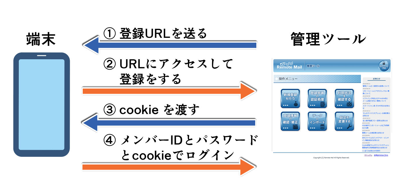 リモートメールはID とパスワードの他、 利用登録時にセットしたCookie を用いて認証を行います。