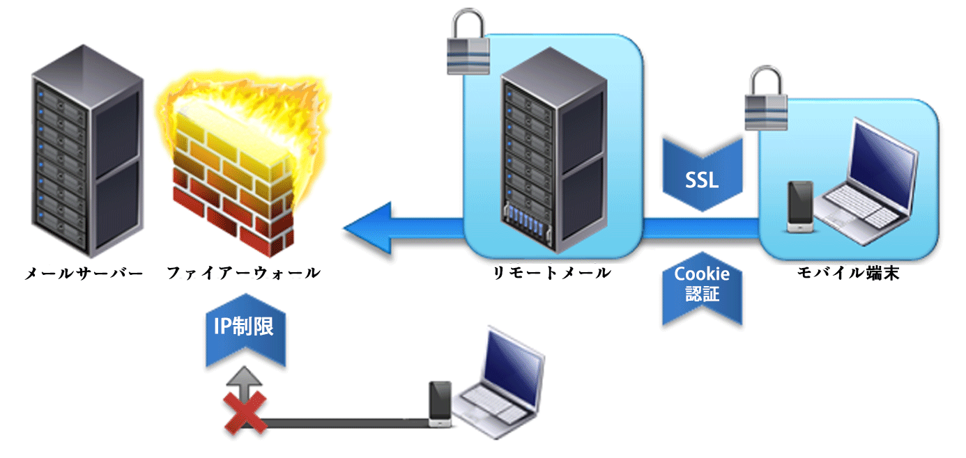リモートメールシステム以外のIPアドレスからのアクセスを制限することで、外部からのアクセスの心配が無くなるとともに、アクセスできる端末も限られたものになり、非常に安全に利用できます。